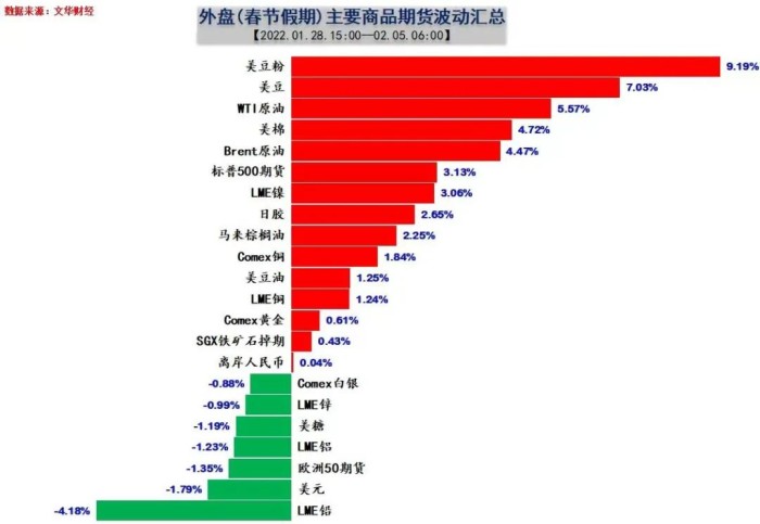 美豆、美豆粕高居春节长假涨幅榜前两位。消息面上,阿根廷大豆产量预期被下调至4200万吨,巴西大豆出口溢价和国内大豆价格均创下新纪录,五家咨询机构下调巴西大豆产量预期。此外,联合国粮农组织植物油价格指数1月平均为185.9点,环比增长4.2%,创历史新高。