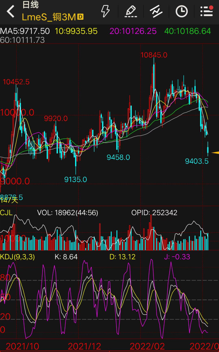 昨日,LME铜和LME铝双双跌至三个月低点,其中LME三个月期铜下跌2.50%,至9525.50美元/吨,盘中触及1月31日以来的最低水平9505美元/吨;LME三个月期铝下跌2.74%,至2969美元/吨,盘中触及2月2日以来的最低点2967美元/吨。市场人士表示,有色金属板块整体走弱缘于市场对于美联储即将加快紧缩政策的预期反应以及全球需求走弱的影响。