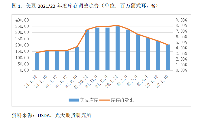 由于出口需求强劲,美国农业部6月供需报告将2021/2022年度美豆出口预估上调3000万蒲式耳至21.7亿蒲式耳,相应库存同幅度下降,2021/2022年度美豆库存最新预估为2.05亿蒲式耳,库存消费比为4.55%;2022/2023年度美豆库存最新预估为2.8亿蒲式,库存消费比为6.11%。显然,美豆旧作较为紧张。经此调整后,未来可下调空间有限。其他方面,巴西和阿根廷大豆产量合计上调240万吨,因收获后发现产量好于预期,最终全球大豆2021/2022年度库存上调91万吨至8615万吨,库存消费比上调至16.55%;2022/2023年度库存上调86万吨至1.0046亿吨,库存消费比为18.33%。这意味着若新作丰产兑现,全球大豆库存恢复前景将偏乐观。美国农业部6月供需报告在确认美豆旧作紧张的同时,也缩小了旧作再紧张的想象空间,市场关注点将更多聚焦在新作方面,比如6月末的种植报告、美豆产区天气等。