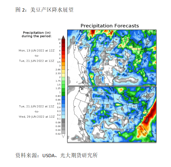 单产方面,市场分歧更大。进入6月,最新预期显示,拉尼娜现象在整个夏季发生的概率与过渡到中性的概率相比,大约为52%,而在7月至9月中性概率为46%。三季度发生和不发生概率接近,还需要进一步观察。从天气预报看,美豆产区6月中旬出现的干燥天气将持续到6月底,7月出现极端灾害天气的概率不大。