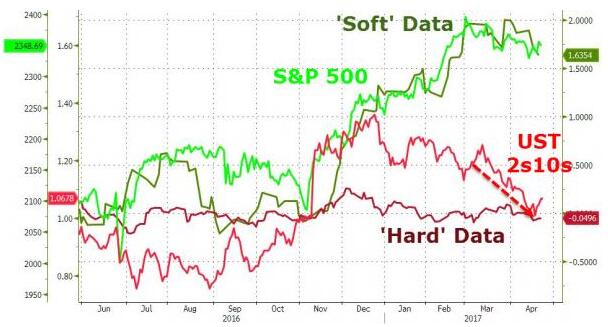 同时,即将出现衰退风险的最准确度量方法之一即是,由不同期限债券确定的债市“收益率曲线”趋平,甚至出现反转。美国的债券收益率曲线远未实现反转,但在去年11月美国大选后,今年再度大幅趋平。自去年11月份以来,美国的2年和10年期国债收益率之差首次缩窄至100个基点以下。许多分析师预计,随着美联储不断提高利率,其将进一步收窄。如下图所示,债券跟踪“硬”的经济数据,股票跟踪“软”的调查数据。