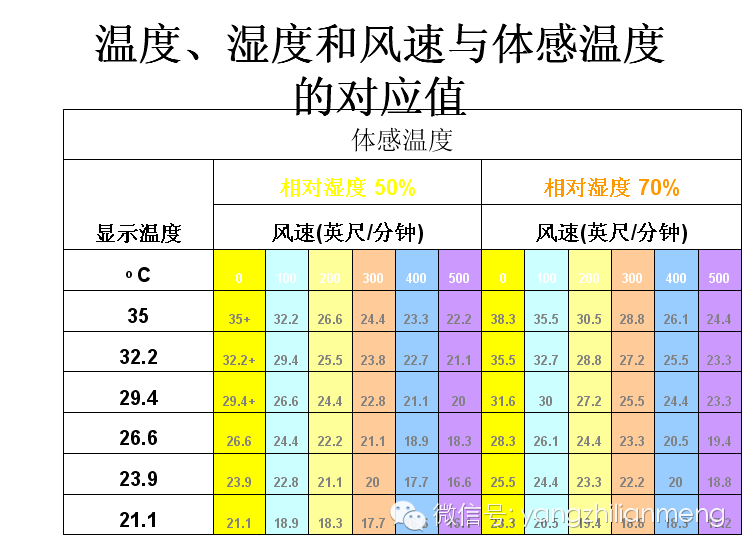 用风机通风,主要考虑的是体感温度,下表是体感温度和鸡舍温度,湿度,风速之间的关系。